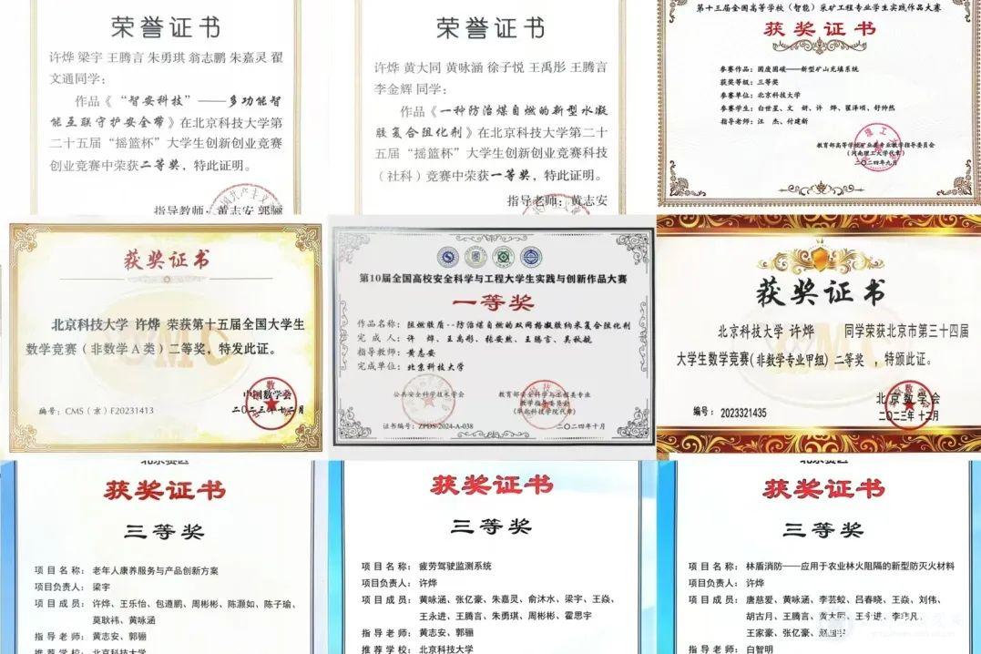 他曾获国家奖学金、国家励志奖学金、新生人民奖学金,全国高校安全科学与工程实践与创新作品大赛一等奖,全国大学生数学竞赛二等奖,中国国际大学生创新大赛北京市三等奖等国家级和省部级奖项六项,ljj雷竞技下载数学竞赛一等奖,ljj雷竞技下载“摇篮杯”大学生创新创业竞赛一等奖,ljj雷竞技下载暑期社会实践金奖等校级奖项十余项,他参与国家自然科学基金项目《防治煤自燃的耐高温凝胶基纳米复合材料阻化机理研究》等多项科研项目,联合发表SCI期刊论文2篇,申请国家发明专利5项,连续两年获ljj雷竞技下载“优秀三好学生”荣誉称号,现任安全2202班班长。